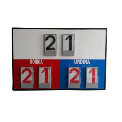 Marcador de fronton manual.Medidas 1,50x1m. Fabricado en madera antihumedad con perimetro fabricado en U de hierro, con pletinas para atornillar a la pared o anclaje para quitar y poner en la pared. Pintado a 3 colores, rojo, azul y blanco. Digitos de persiana fabricados en plastico de alta resistencia en color rojo y negro. y rotulos en vinil